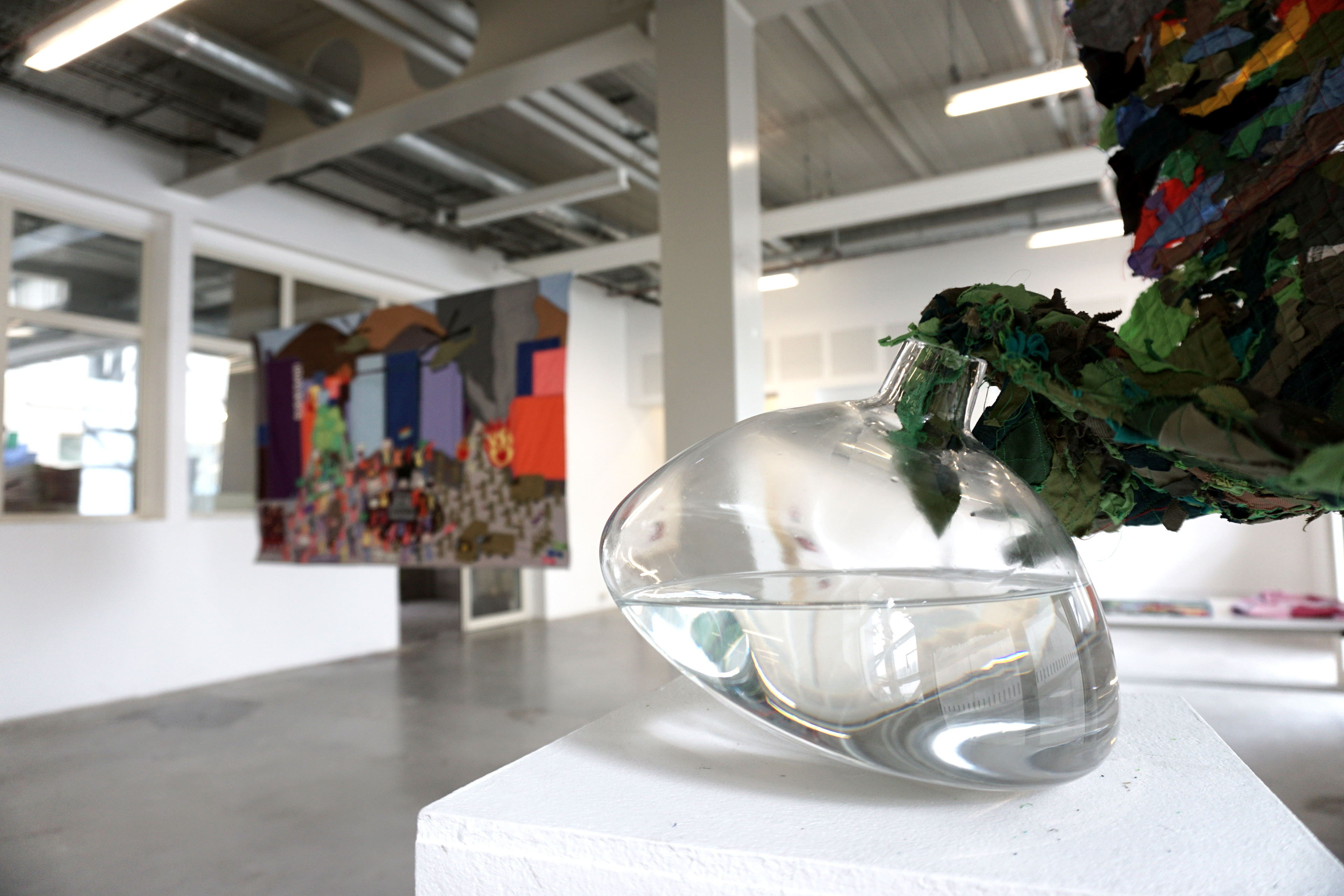 Blown glass bottles and textiles woven, embroidered or reconstructed from scraps.