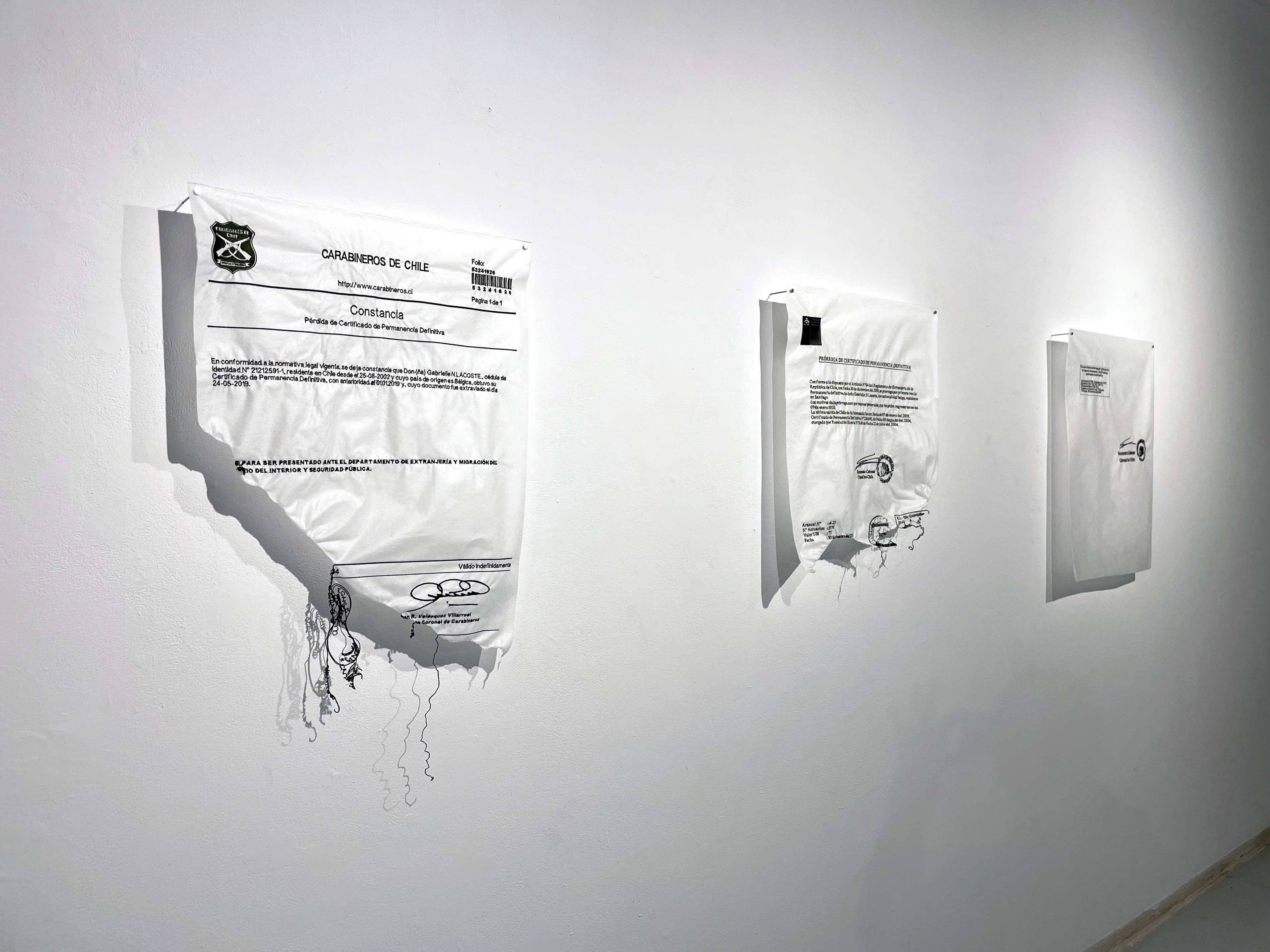 Permanencia is a series of digital embroidered pieces on dissolvable fabric. These pieces are bigger scale reproductions of the last legal documents the artist possesses, that proved her legal status in Chile. As these documents become obsolete, and the last members of her family leave Chile, the artist reflects on her attachment to her homeland.